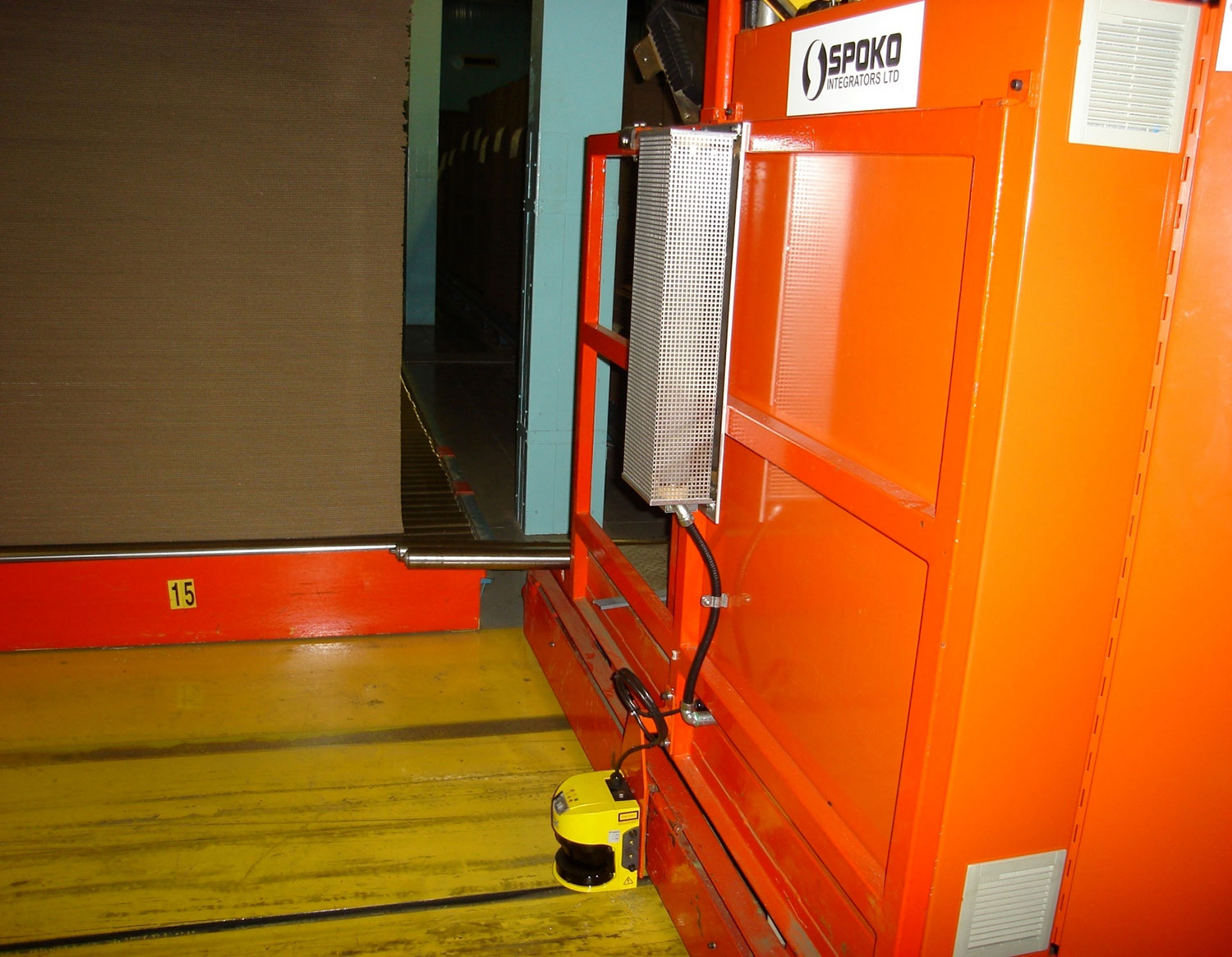 SPOKO Integrators Ltd. provided multiple Control Systems for mobile and man less operated SmartCars. These trolleys are a part of conveyor transport lines that receive raw materials (corrugated cardboard stacks) from the Corrugator Machine and transport to multiple printing and cutting machines. SmartCars communicated with the infeed of material, loaded the batch onto itself, traveled to the designated line and unloaded. Operation continued 24 hours per day servicing all of the printing machines. Since the SmartCar is not operated by a person, and travels across the plant floor, the integrated two laser safety scanner system is required to be 100% reliable and take into consideration any unsafe conditions that could arise during its operation; such as, a person walking in its path of travel.