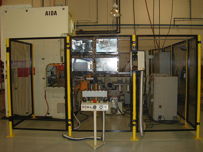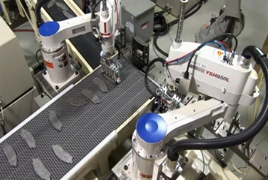 SPOKO Integrators Ltd. has designed and built a transfer system for solid brake plates based on Vision Robotic Transfer System. The robotic system consisted of two high speed SCARA robots and one six axis robot. Two smaller robots collected pads placed randomly on a conveyor. A SICK 3D Vision located the brake plates on the conveyor and guided the SCARA robots to the pickup locations on the continuously moving conveyor. The Vision System, Conveyor Encoder, and two Scara Robots collaborates together to identify exact location and orientation of the good parts to be picked up and placed the individual pads into one of the six nests (3 per robot). When the nests loading was complete, the six-axis robot would pick 15 pads stacked one on top of another using a custom built end of arm tooling and transport them to the press for further processing. The entire process was protected by the use of hard guarding with safety solenoid interlocked access gates and robot positioning safety system. The process could be safely monitored via four monitors located outside the fenced area.