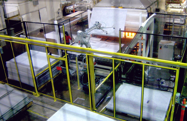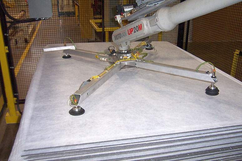 SPOKO Integrators Ltd. provided a robotic cell for loading one headliner substrate at a time into the furnace. For this application Spoko used a UP20 Motorman robot. One of the challenges was ensuring the continuous supply of the substrates while simultaneously providing a safe environment for workers who replenished empty skids with new ones without effecting the operation of the robotic arm. The second challenge was to design and develop a system that compensated shifting headliners on the skids. The end-of-arm tooling was utilized along with clever programming to realign the sheets of substrate. Robot programming was also utilized to manage the static build up between the substrates.